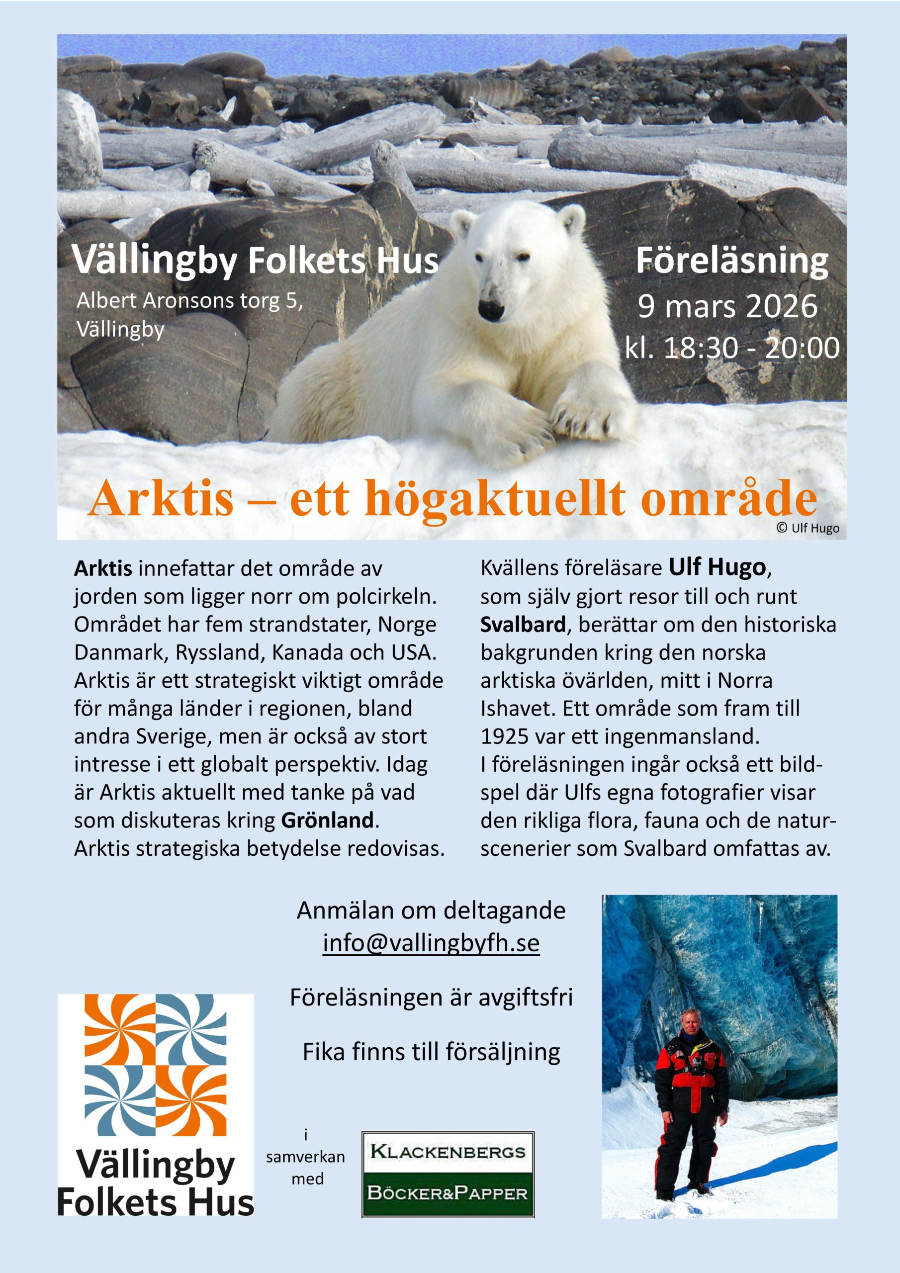 I föreläsningen ingår också ett bildspel där Ulfs egna fotografier visar den rikliga flora, fauna och de naturscenerier som Svalbard omfattas av.